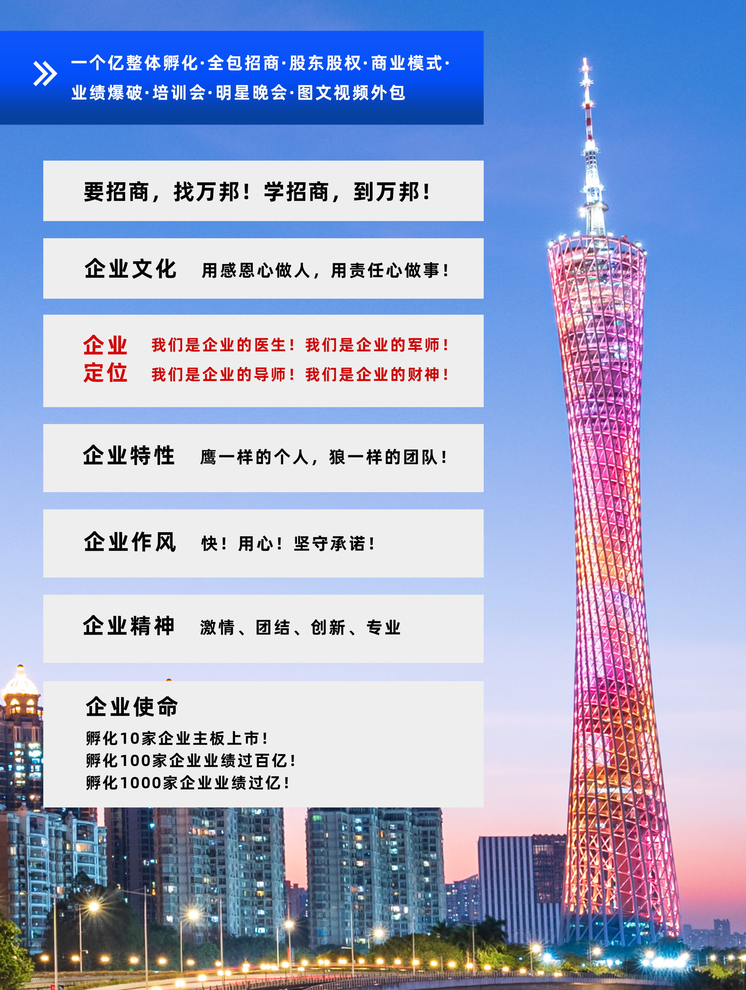 萬邦集團(tuán)成立于2003年6月,專注于為企業(yè)進(jìn)行招商和整體孵化,包含公司診斷、產(chǎn)品定位到量身打造商業(yè)模式系統(tǒng),再到投人、投錢、投資源,一起干的分紅股東招募,鐵血軍團(tuán)的打造,全國招商會(huì)議,為企業(yè)建立一套完善;成熟的招商系統(tǒng),教育系統(tǒng)、培訓(xùn)系統(tǒng)。